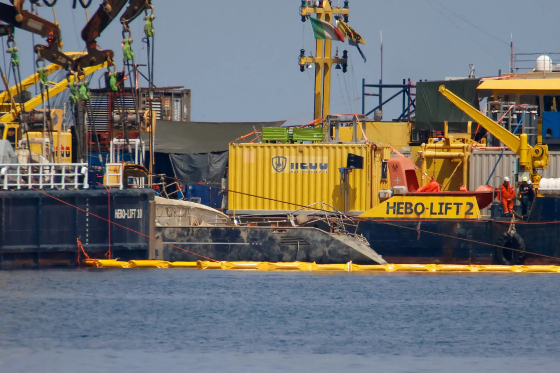 Плавучий кран Hebo-Lift 10 поднял корпус затонувшей суперъяхты на поверхность Тирренского моря. Теперь начнется работа экспертов и следователей. И тем, и другим предстоит определить, что произошло и кто виноватт