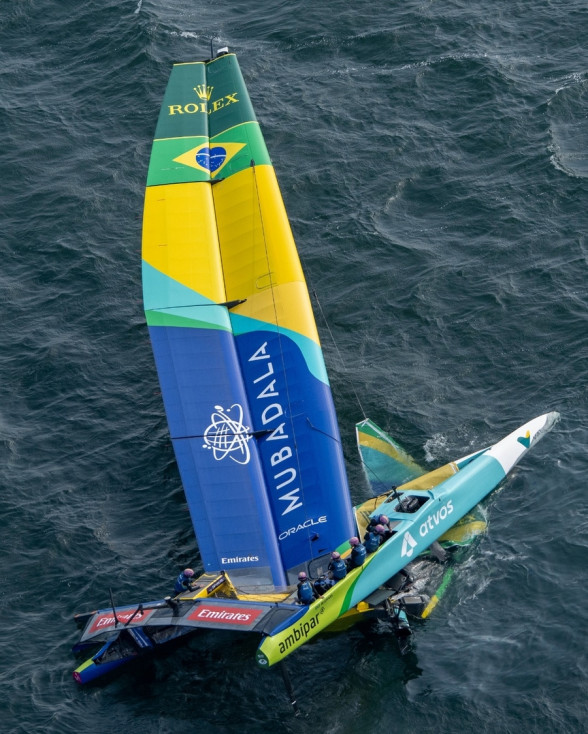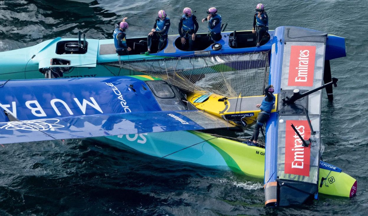 При порывистом ветре силой 22 узла у France SailGP Team во время маневра на наветренной отметке сломался правый руль. Но это, как вскоре выяснилось, лишь небольшая неприятность, потому что через несколько минут у бразильской команды Mubadala SailGP, ведомой Мартиной Граэль, разрушилась передняя поперечная балка, катамаран упал с крыльев и зарылся в воду. Снасти такелажа не выдержали, мачта-крыло рухнула… Это чудо, что никто их экипажа не пострадал, но катамаран, похоже, теперь годен лишь для утилизации. Понятно, что команда не будет принимать участие в Гран-при Германии по парусному спорту Sassnitz SailGP.