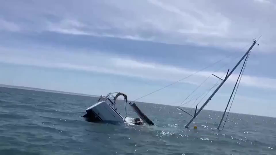 Поправка. Съемка велась как с борта впоследствии затонувшей яхты, так и с оказавшегося поблизости прогулочного судна, на который и "переместились" спасенные (тут уж без кавычек) яхтсмены. Информация, что подоспели сотрудники береговой службы спасения, была ошибочна.