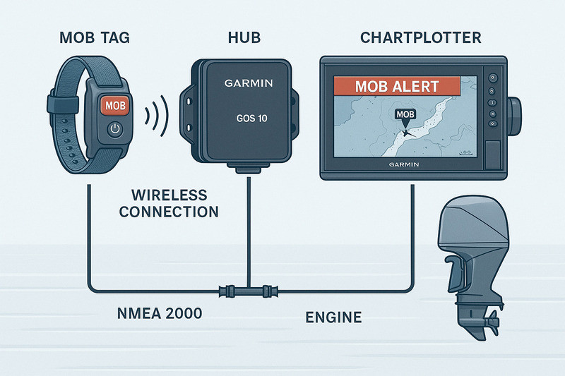 Миниатюрные носимые метки отслеживают присутствие экипажа на борту, а при потере сигнала система мгновенно создает точку MOB, подает тревогу и при необходимости глушит двигатель.