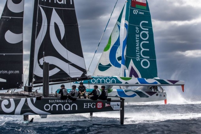 Известна профессиональная команда Oman Team, выступающая на различных яхтах по ходу сезона на многих крупных регатах, выложила в Facebok, видео одной из своих тренировок. На ней сошлись катамаран GC32 и макси-тримаран MOD70. На ней видно, что более современное судно (катамаран), по меньшей мере, не уступает в скорости сопернику, который почти в два раза больше.