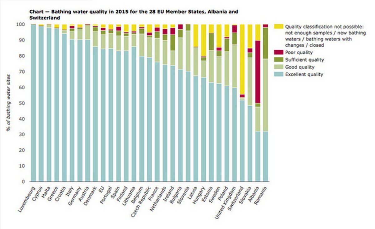 Лидируют по чистоте Люксембург, Кипр, Мальта, Греция, Хорватия, Италия, Германия и Австрия (см. схему). 90 процентов проб, взятых в этих странах, получили оценку «отлично». Но Италия вместе с Францией лидирует по числу загрязненных водоемов – по 95 мест.