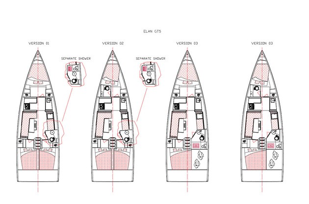 В качестве платформы для создания новинки Elan выбрал корпуса таких моделей как E4 и S4 (скоростные круизеры), созданные своим давним партнером – дизайнерским бюро Роба Хампфриса. Но палуба и подпалубное помещение у нее будут принципиально новыми, с высоким расположением просторных кают с большими иллюминаторами. Что касается палубы, то она будет менее спортивной, чем у предшественниц, и будет оптимизирована под управление небольшими экипажами, с утопленной проводкой оснастки и выводом ее на место рулевого (с двумя штурвалами). На корме будет установлена откидная купальная платформа. Предлагается, естественно, не один вариант подпалубного обустройства (см. схему).