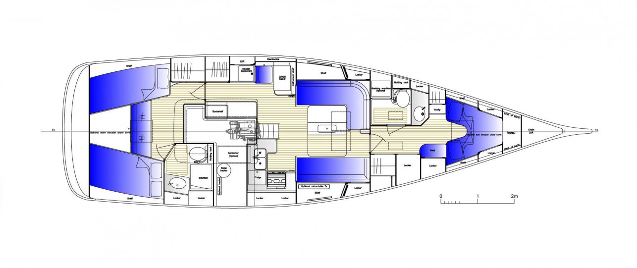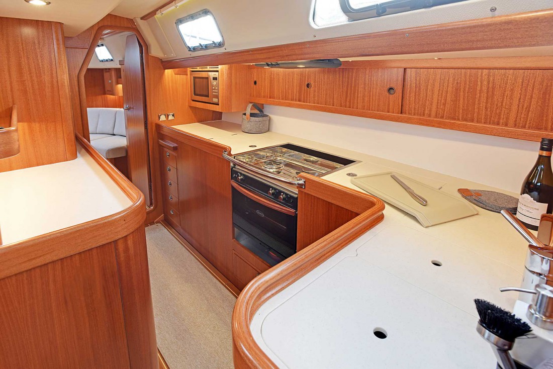 Наконец, вы сами можете выбрать планировку камбуза. Это либо стандартное U-образное расположение по правому борту, либо линейное с большим рабочим пространством. В качестве опции предлагаются морозильник, СВЧ, измельчитель и посудомоечная машина.