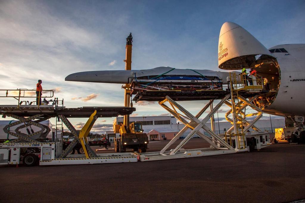 Катамаран AC50 новозеландской команды, который примет участие в 35-м Кубке «Америки», в разобранном виде доставлен на Бермуды