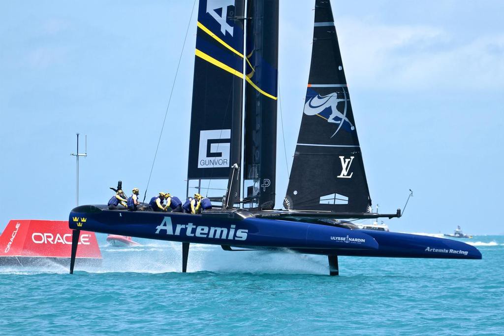 Artemis Racing с трудом выиграла старт у отлично оборонявшейся Emirates Team New Zealand, но новозеландцы неслись по пятам и прилетели на 1-ю марку лишь на три секунды позже. По пути к нижним 2-м воротам у новозеландской яхты выскочило из воды наветренное перо руля. Рулевому пришлось быстро увалиться, катамаран упал с фойлов и ушел в воду. В итоге на знаке киви были на 20 секунд позже шведов. Сделав сплит, Питер Берлинг сумел снова хорошо разогнаться и на лавировке сократил отставание с 400 метров до ста, оказавшись на третьих верхних воротах лишь на 5 секунд позже яхты Нэйтана Ауттериджа.