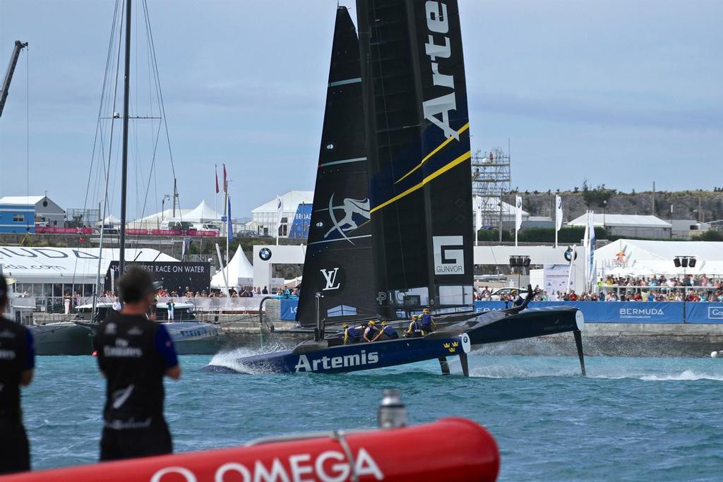 Хотя рулевой Artemis Racing Нэйтан Ауттеридж обещал бороться до конца и не дать Emirates Team New Zealand спуску, в первой гонке понедельника у шведов все пошло не так. Юго-западный ветер в 7,5 узлов в ходе гонки начал быстро слабеть. На старте обе яхты оказались практически одновременно, но Artemis пересекла линию на доли секунды раньше сигнала и получила штраф. Отстав в качестве наказания на две длины корпуса, Ауттеридж оказался на 1-й марке на 5 секунд позже шкипера Emirates Team Питера Берлинга. На нижних 2-х воротах новозеландцы взяли левый буй, а подошедшие на 17 секунд позже шведы сделали сплит и пошли вправо. Правая сторона оказалась значительно выгоднее, и, идя в хороших правых порывах, Artemis почти догнала новозеландцев, но тут…