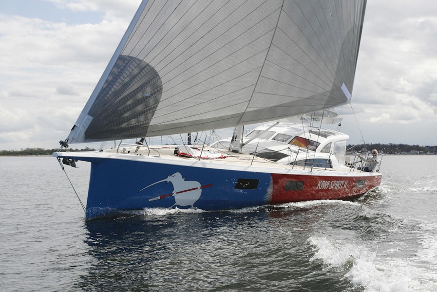 На Kiwi Spirit II установлен необычный для яхт этого типа подъемный киль кинжального типа, длина которого колеблется от стандартных 1,60 метров до 3,75 метров. 23,3-метровая мачта довольно сильно смещена к корме. Автоматический стаксель и грот на длинном гике контролируются бегунком на транце. «Я могу идти на полном парусе даже при сильном ветре, не беспокоясь о рифлении», — говорит владелец.