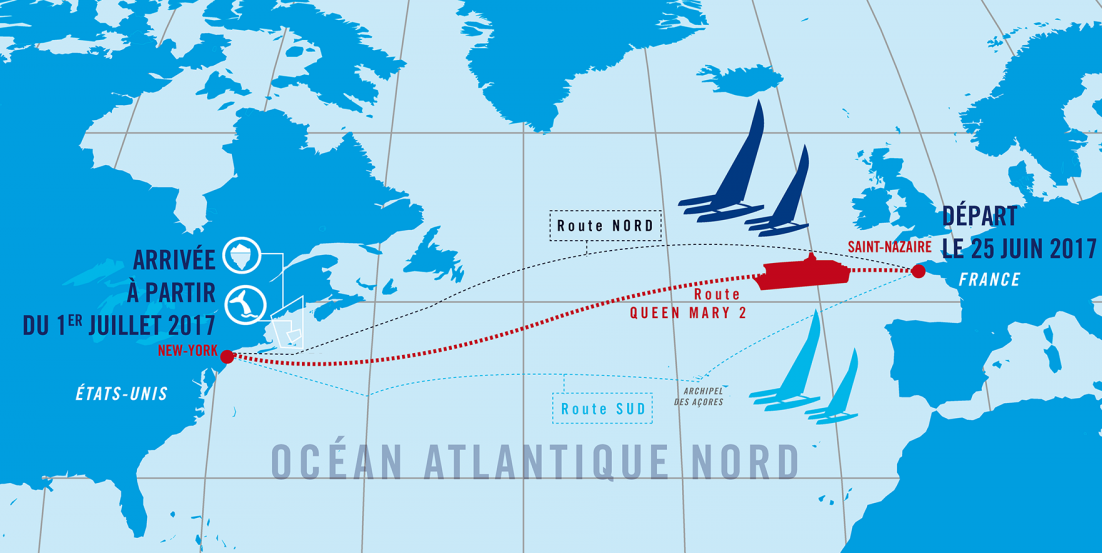 Queen Mary 2 с почти тремя тысячами пассажиров на борту выйдет из порта Сен-Назер во Франции 25 июня. Одновременно с лайнером стартуют четыре тримарана класса Ultime, которые поведут знаменитые шкиперы - Macif (Франсуа Габар), Sodebo (Тома Ковиль), Actual (Ив ле Блеве) и IDEC (Франсуа Жуайон).