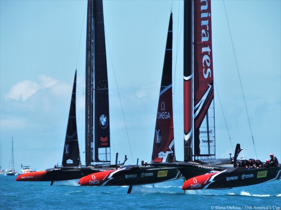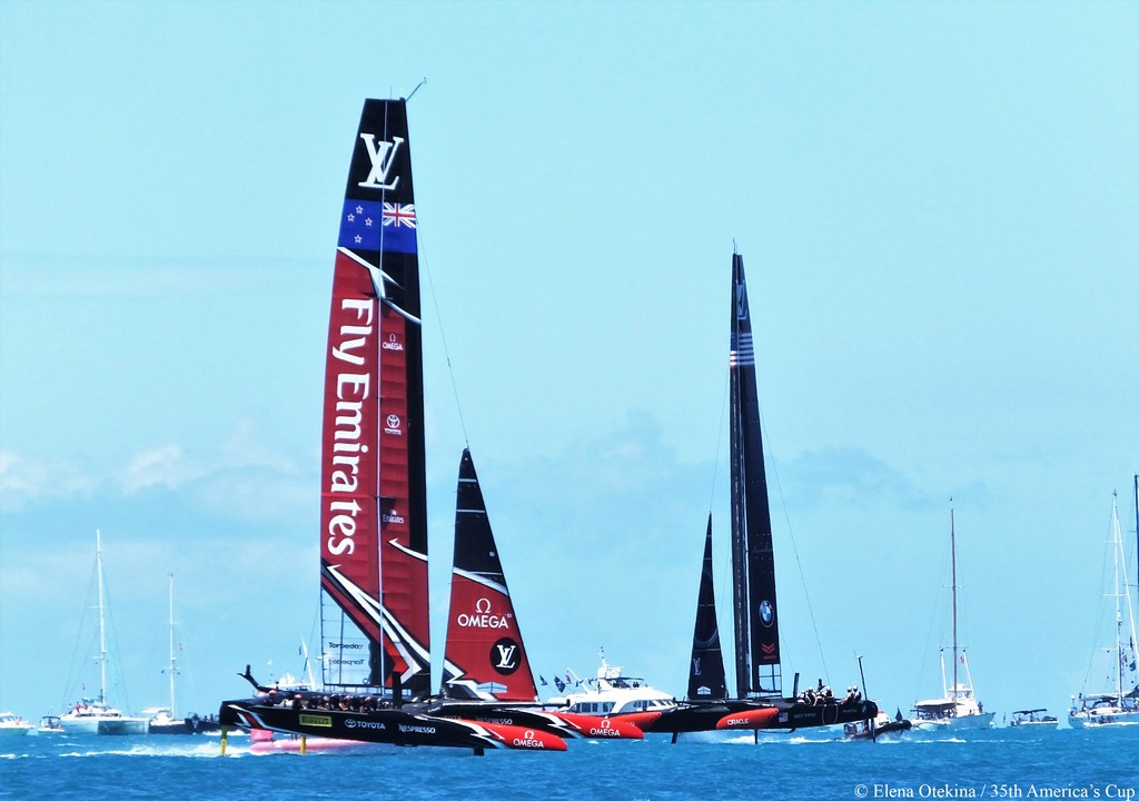 В первой гонке Oracle проиграла старт, зачем-то увалившись на подходе к линии и сделав лишний поворот, в то время как ETNZ хорошо разогналась и свободно понеслась вперед. Минимальный отрыв в 3 секунды на первом знаке превратился в 5 секунд на нижних воротах. На первой лавировке новозеландцам удалось поймать хороший левый порыв, и на верхний знак они пришли уже на 32 секунды раньше. Ко второму верхнему огибанию разница составила 35 секунд. На последнем полном курсе ETNZ не удался поворот, и Oracle смогла сократить разрыв, однако времени, чтобы обогнать соперников, Спитхиллу не хватило. Отставание в 12 секунд на последних нижних воротах осталось таким же и на финише.