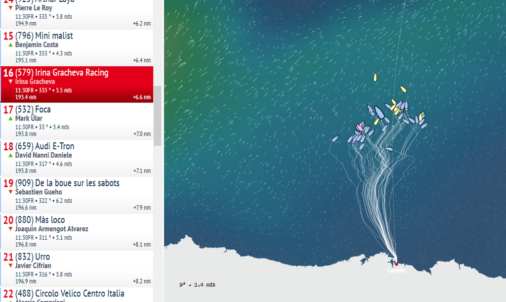 Наша Ирина Грачева в 13.30 вторника по московскому времени шла 16-й во флоте из 45-ти судов (серийные лодки, соло), отставая от лидера – Гийома Л’Остиса – на 6,6 морских мили.