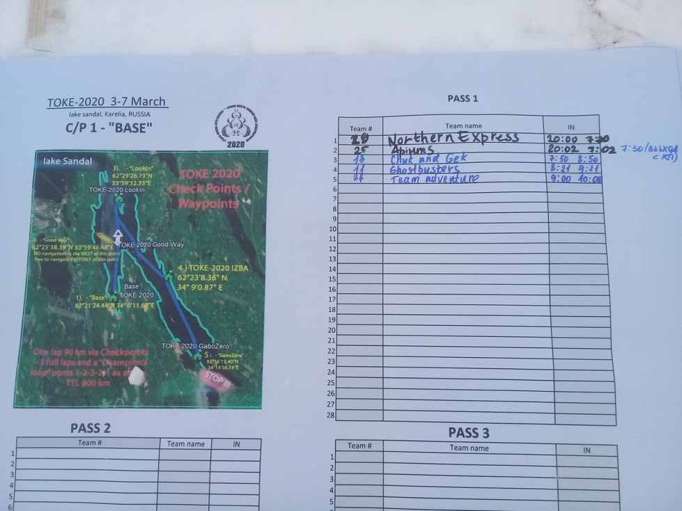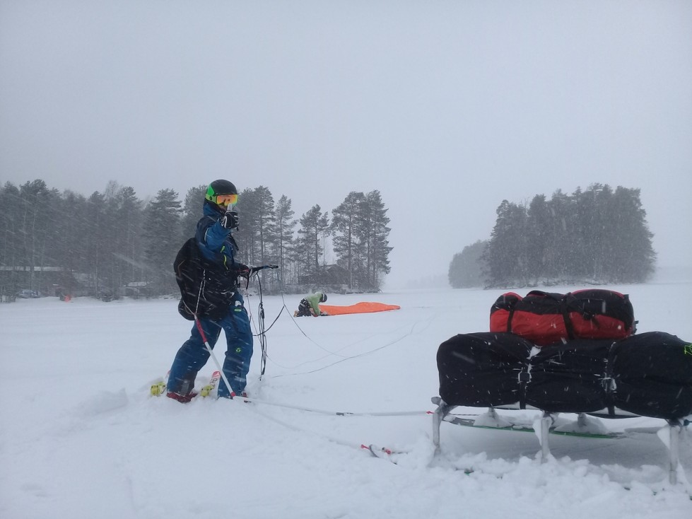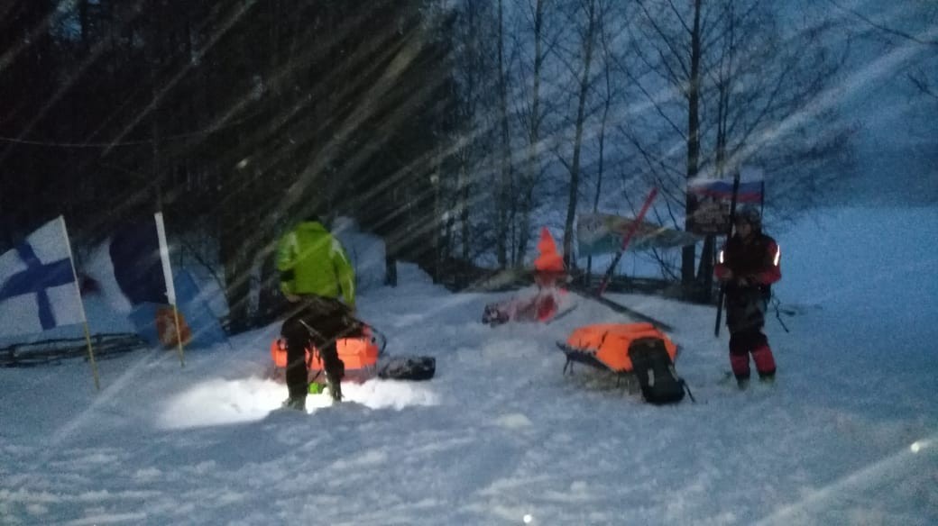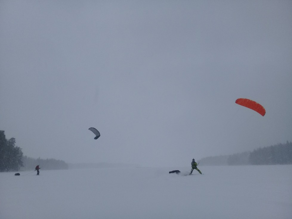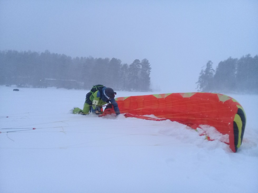 С контрольного пункта «Лукин», который находится в 15 км от точки старта приходят неутешительные новости: «Около КП покрытие ровно, 15 см снега. Но он становится тяжёлым, теплеет. Пурга не прекращается. В озере гладкий лёд перемежается застругами до 30 см высотой. Ехать очень сложно. Ветер рваный, сильный. «Снежные ангелы» прилетели на 4 кв. м. кайтах и сказали, что это пусть неспешно, но безопасно. Несколько команд идут в сцепках, на одном кайте, поскольку не имеют столь малых площадей. В целом участники говорят, что очень трудно идти. Примерно половина команд, отойдя от нашего КП метров на 500, роняют кайты и долго потом не взлетают.»