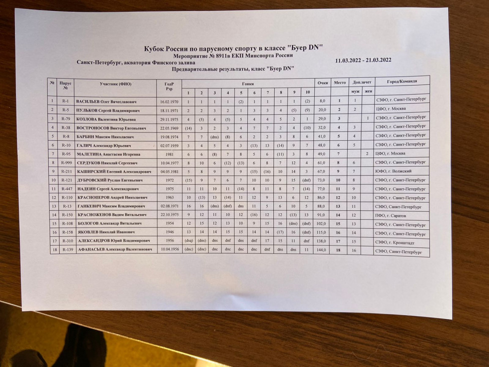По итогам регаты и 10-ти прошедших гонок первое место с 8 очками (два выброса) занял Олег Васильев (СПб), второй -Сергей Пульков из Москвы, третье место у Валентины Козловой (СПб), которая победила в женском зачете регаты.
