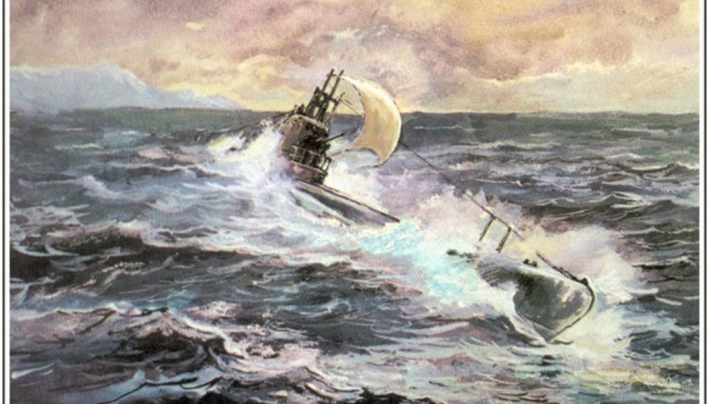 «Наутилус» вышел на рейд под своим необычным реечным парусом. В 200 м от шлюпа парус был свернут, мачта убрана, подводная лодка погрузилась в воду, а через несколько минут прогремел взрыв, и на месте шлюпа взметнулся столб воды и обломков.