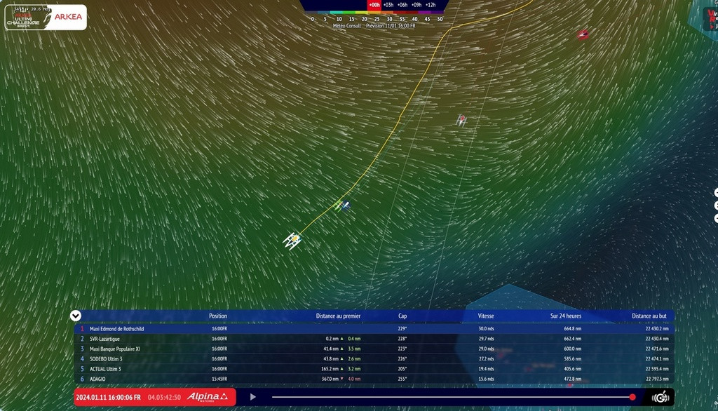 Маршан оказался удивительно быстрым на своем бывшем Macif в самом начале регаты и был в состоянии идти в ногу с гораздо более молодыми конструкциями. Однако усиление ветра поставило все на свои места – в этих условиях его яхта Actual Ultim 3 неконкурентоспособна. Аутсайдер Эрик Перон к этому же моменту отстал на 350 морских миль на своем бескрылом Adagio.