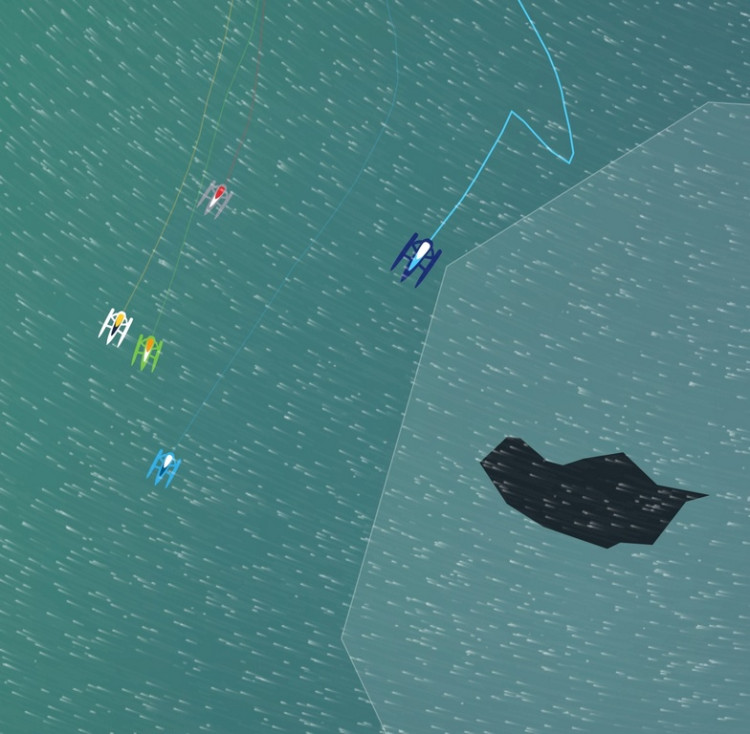 Ветер вчера вечером поворачивал все дальше и дальше вправо, пока не сменился с северного на юго-западный, и тримаранам пришлось бороться с сильным встречным воздушным потоком скоростью до 45 узлов. Шарль Кодрелье был первым, кто достиг критического положения примерно в 10 часов вечера (ГМТ) в среду, сделав поворот на другой галс. За ними быстро последовали SVR Lazartigue, Sodebo Ultim 3 и Maxi Banque Populaire XI . Такой маневр в одиночку на 100-футовом судне в условиях сильного волнения весьма непрост.