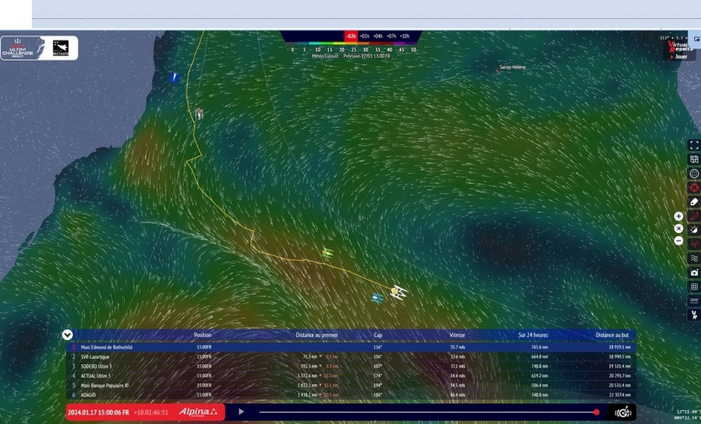Тома Ковилль (Sodebo Ultim 3) отстает от лидера почти на 400 миль и идет немного севернее практически с той же скоростью. До сих пор он очень хорошо участвовал в регате, учитывая тот факт, что его лодка не совсем соответствует уровню ходкости трех лучших тримаранов. Но скоро лидеры должны будут (вероятнее всего) взять южнее вслед за циклоном, и вот тут северная позиция Ковилля может сыграть против него.