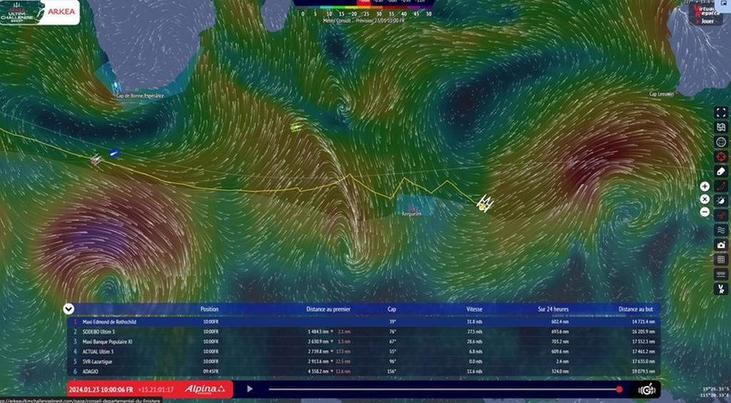 А на переднем крае кругосветной гонки темп не ослабевает. Во вторник утром Шарль Кодрелье вновь шел со средней скоростью чуть менее 32 узлов. Maxi Edmond de Rothschild съедает мили просто в невероятном темпе. Утром 23 января 49-летний Кодрелье и его тримаран почти достигли 82-го градуса восточной долготы. Следующий мыс - Льюин, новая веха в одиночном кругосветном плавании Arkea Ultim Challenge, ждет их на 115-м градусе долготы.