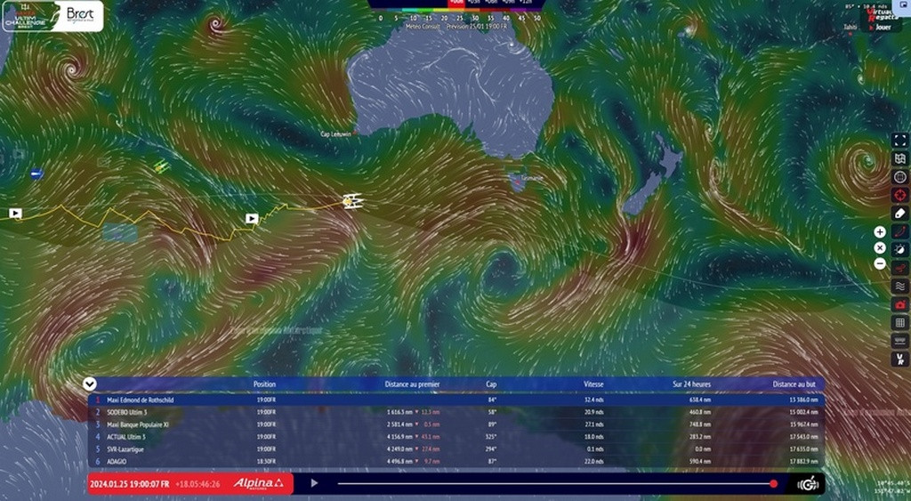Но лидер устоял и приблизился к австралийскому побережью. Следом за ним на втором месте расположился Тома Ковилль (Sodebo Ultim 3). Столкнувшись с особенно опасными условиями, Ковилль сравнил последние несколько дней с «поездом-призраком», в котором «нет признаков жизни». С тех пор небо прояснилось, и он смог продолжить свое путешествие с немного большим спокойствием. Что же касается Армеля Ле Кле (Maxi Banque Populaire XI), то для него все огни вновь горят зеленым цветом, и он быстро продвигается вперед.