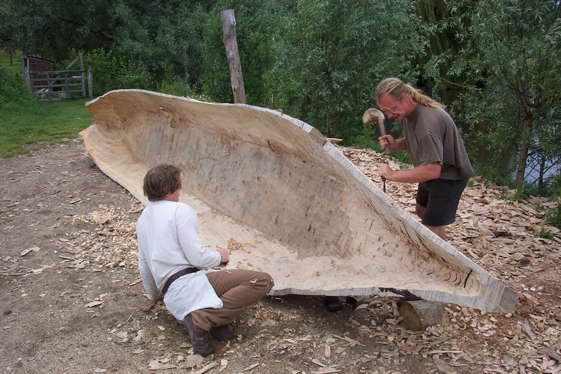 Ученые, и не только британские, полагают, что первый вид водного транспорта появился в период позднего палеолита. Именно в начале этого периода зародилось «регулярное» рыболовство, чему способствовало изобретение лодки-однодревки. Делали лодки из цельных стволов деревьев, которые выжигали изнутри и выдалбливали (на фото – реконструкция процесса, а еще вспомним неудачную попытку сотворить такую лодку незабвенного Робинзона Крузо), а затем обтесывали снаружи с помощью каменных инструментов. Понятно, что для этого требовались большие деревья, а что было делать тем рыболовам, что жили в безлесной местности? Они изготавливали – вязали! – челны из тростника и папируса (см. книги Тура Хейердала). Причем, если все же говорить о первенстве, то неизвестно, кому его присуждать – долбленкам или тростниковым лодкам.