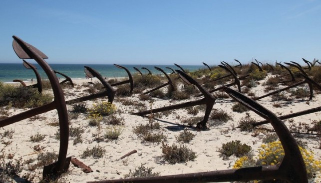 О достоинствах острова Тавира, что в районе Алгавре на юге страны, португальцы особо не распространяются. Иначе от туристов не было бы отбоя, а так это их уголок, полупустынный и один из немногих на Атлантическом побережье, где можно купаться без тоскливых воспоминаний о гидрокостюме. Пляжи на острове белоснежные, кровососущих насекомых нет, много птиц, но не только… На этом острове находится уникальное в своем роде кладбище якорей. Когда-то здесь активно ловили тунца специальными сетями, напоминающие воронку, а чтобы удержать сети вместе с добычей, использовались массивные якоря, с виду обычные «адмиралтейские». Увы, с годами и столетиями рыбы в прибрежных водах становилось все меньше, и к концу 1960-х годов тунец здесь почти повывелся. Рыбацкие лодки пошли на слом, а якоря стали использовать для закрепления дюн. Получилось эффективно и эффектно.