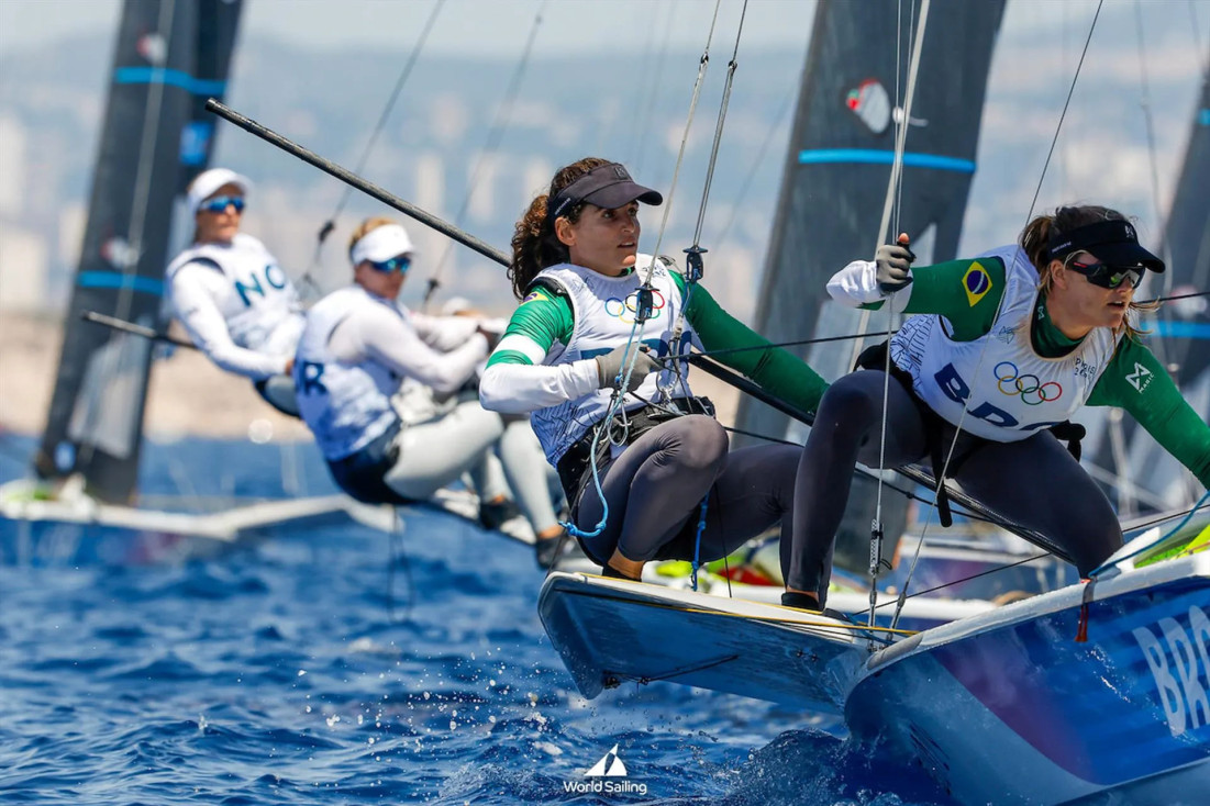 Молодой новозеландский экипаж 49er в составе Айзека МакЧарди и Уильяма МакКензи, участвующий в своей первой олимпийской регате и заменивший золотых и дважды серебряных призеров Олимпийских игр Питера Берлинга и Блэра Тьюка, превосходно справился с задачей и по итогам первого гоночного дня закрепился на верхней строчке таблицы. На втором месте бразильцы, на третьем – представители Уругвая.