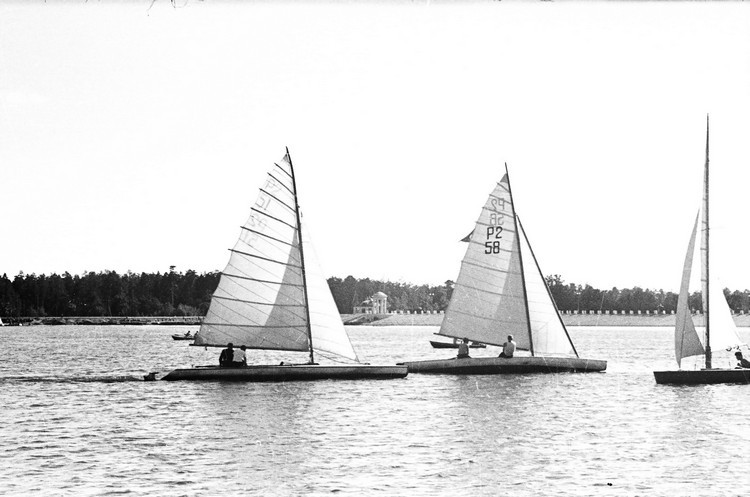 За два года до этого новые водохранилища – Химкинское, Клязьминское, Пестовское, своим возникновением обязанные каналу Москва-Волга, наконец-то наполнились водой до запланированного уреза. Предстояло «заселить» их яхтами, ведь до того узкая и мелкая Москва-река к занятиям парусным спортом не располагала, максимум – к гребному (на снимке лагерь Осоавиахима на Москве-реке). На помощь москвичам пришли ленинградцы – они привели в столицу 10 швертботов (на снимке), поделились своими Р-30 волжане (это они у плотины Химкинского водохранилища). Лодки распределили по яхт-клубам, которых к следующему году уже было шесть (на снимке яхты и здание парусной секции водно-моторного клуба им. Баранова, ныне здесь, в Хлебниковском затоне, располагается яхт-клуб «Химик»). Учителями москвичей стали ленинградцы, и уже осенью было проведено первенство столицы. Прошло два года, и москвичи приняли вызов яхтсменов Горького - и сокрушительное проиграли. Им еще предстояло учиться и учиться, что они и делали.