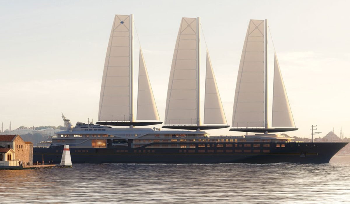 О судне… Три мачты высотой более 100 метров каждая несут жесткие паруса общей площадью свыше 4500 квадратных метров. При благоприятных условиях это позволит не использоваться двигатель, который, конечно же, есть, работающий на сжиженном газе. Потому что экология прежде всего! На это же нацелена система искусственного интеллекта, позволяющая предотвращать столкновения с китами. Технология динамического позиционирования, это уже о другом, устраняет необходимость в постановке на якорь.