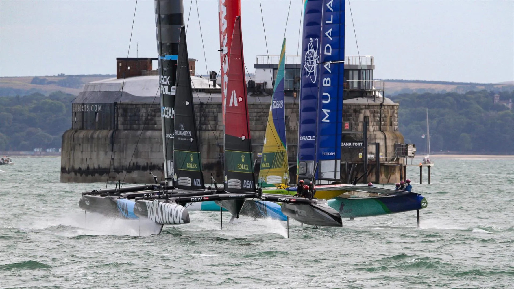 Команда Emirates Great Britain SailGP под руководством Дилана Флетчера оправдала их ожидания. По окончанию первого гоночного дня Emirates Great Britain Sail Grand Prix (Emirates – они везде) она заняла первую в общем зачете. Она же показала максимальную скорость дня - 83,5 км/ч. Безусловно, сказалось великолепное знание «домашней» акватории. Особенно наглядно это проявлялось во время прохождения отрезка дистанции у «наследия минувшей войны» – форта Spitfire. Если некоторые команды слишком удалялись от него, а другие, наоборот, попадали в ветровую тень, то британцы проходили идеально, выигрывая секунды и метры.
