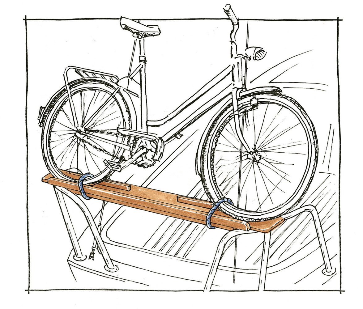 Рамы опираются на бакштаги и дополнительно притягиваются к ним резиновыми жгутами. В порту велосипеды можно быстро снять и так же быстро убрать на место. При наличии только одного ахтерштага потребуются дополнительные оттяжки для остойчивости конструкции.
