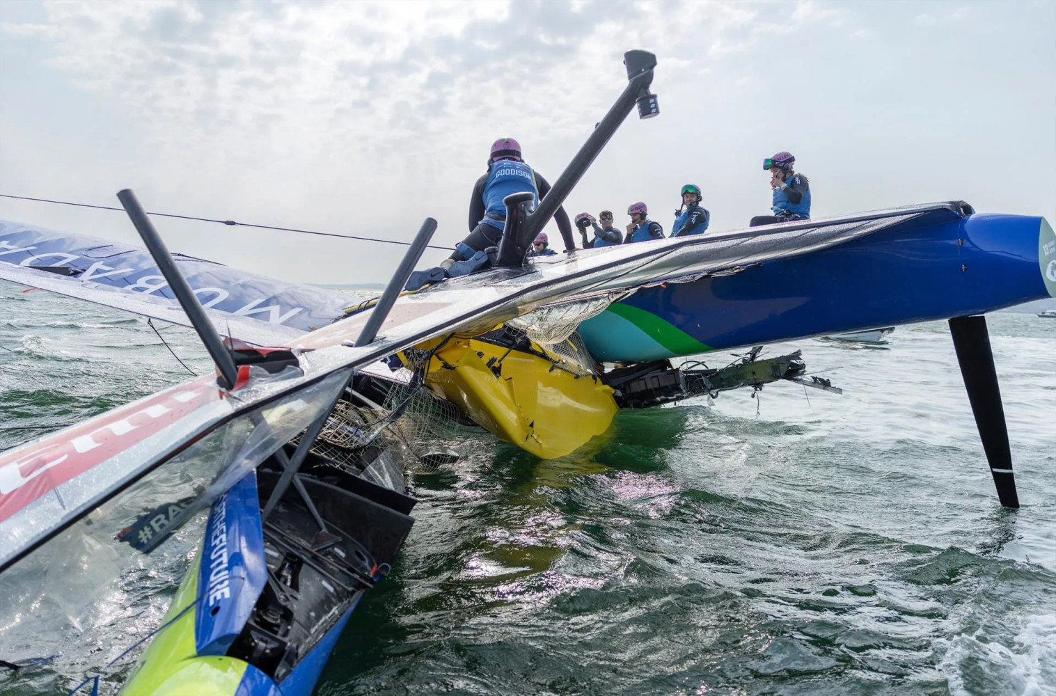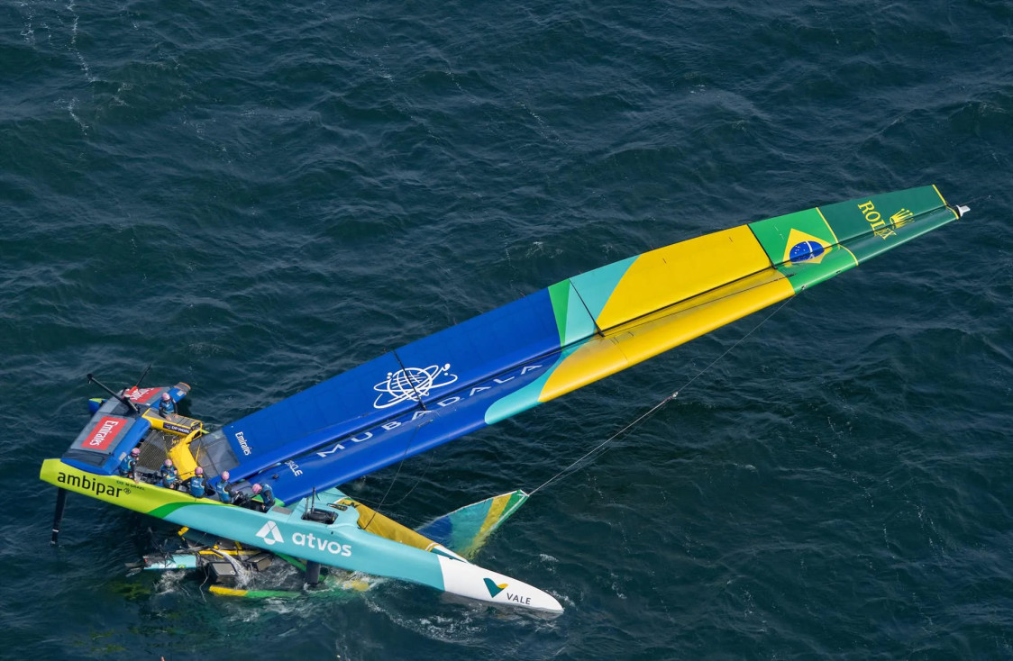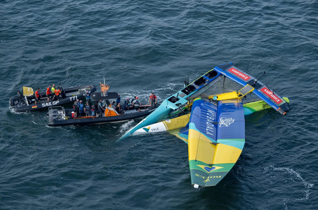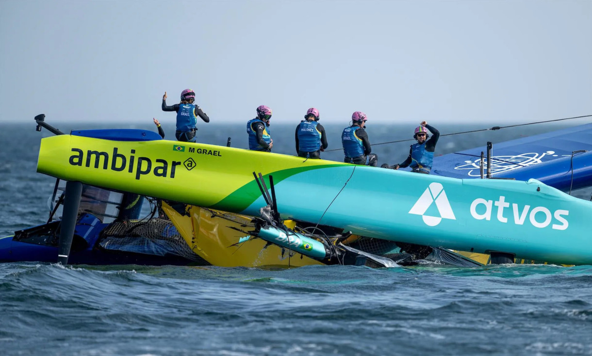 При порывистом ветре силой 22 узла у France SailGP Team во время маневра на наветренной отметке сломался правый руль. Но это, как вскоре выяснилось, лишь небольшая неприятность, потому что через несколько минут у бразильской команды Mubadala SailGP, ведомой Мартиной Граэль, разрушилась передняя поперечная балка, катамаран упал с крыльев и зарылся в воду. Снасти такелажа не выдержали, мачта-крыло рухнула… Это чудо, что никто их экипажа не пострадал, но катамаран, похоже, теперь годен лишь для утилизации. Понятно, что команда не будет принимать участие в Гран-при Германии по парусному спорту Sassnitz SailGP.