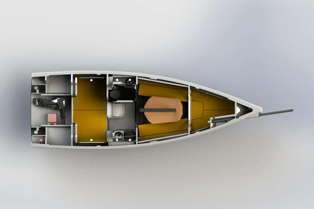 Внутреннее пространство продумано до мелочей и выверено на посадочном макете: две каюты, камбуз, гальюн, салон с раскладным столом и высотой потолка до 1,89 м. Современный объемный интерьер и рациональная компоновка создают условия, близкие к яхтам тридцатифутового класса.