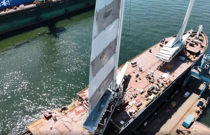 Чисто парусным это грузовое судно назвать нельзя. Его двигатели всегда будут работать «на ход». Но использование парусов при скорости 11 узлов снизит расход топлива в 5 раз по сравнению с обычными подобными судами. Сейчас оно в Атлантике…