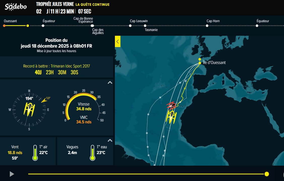Макси-тримаран Sodebo Ultim 3, только-только вернувшийся с гонки Transat Café L’OR, в которой стал вторым в своем классе, ненадолго задержался на своей базе в Лорьяне: уж очень подходящее «погодное окно» выдалось! На этот раз с полным экипажем, во главе которого бессменный Тома Ковиль, 15 декабря он пересек стартовую линию между островом Уэссан и мысом Лизард и отправился в нон-стоп кругосветку, чтобы наконец-то завоевать Jules Verne Trophy.