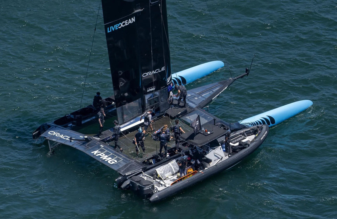 А впрочем, не шведский форсаж стал главным событием дня. Black Foils New Zealand нарушила правила, подставилась, и катамаран Switzerland SailGP Team протаранил F50 новозеландцев, откромсав у него кусок транца. Результат печален: швейцарцы отправились ремонтироваться, а команда Питера Берлинга мало того, что была оштрафована на 8 очков, так и вовсе снялась с соревнований, повреждения корпуса оказались слишком серьезны.