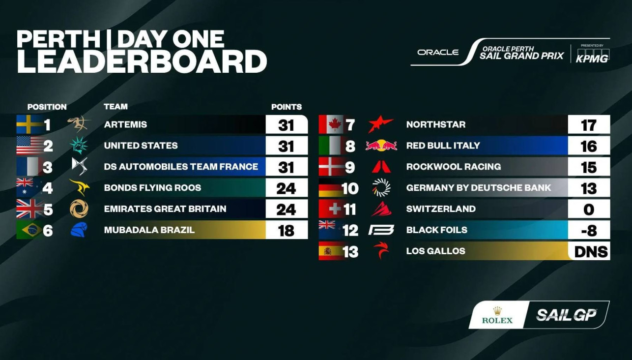 По итогам первого дня гонок (при равенстве очков) шведская Artemis возглавляет турнирную таблицу. United States SailGP Team – вторая. DS Automobiles Team France замыкает тройку лидеров.
