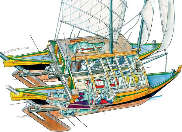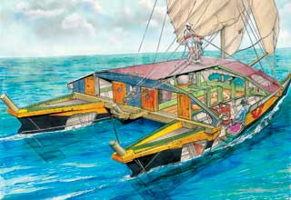 Строительство 38-футового катамарана (все-таки это катамаран) продолжалось год. Эрик де Бишоп назвал его «Каимелоа», что по-гавайски «за далеким горизонтом». Но те, кто узнавал о его намерении дойти на нем до Франции, за глаза называли катамаран «Два гроба». В этом их поддерживали ученые, с которыми Эрик де Бишоп, будучи дипломированным гидрографом, спорил, утверждая, что древние полинезийцы с легкостью занимались «культурным обменом» между всеми островами Океании.