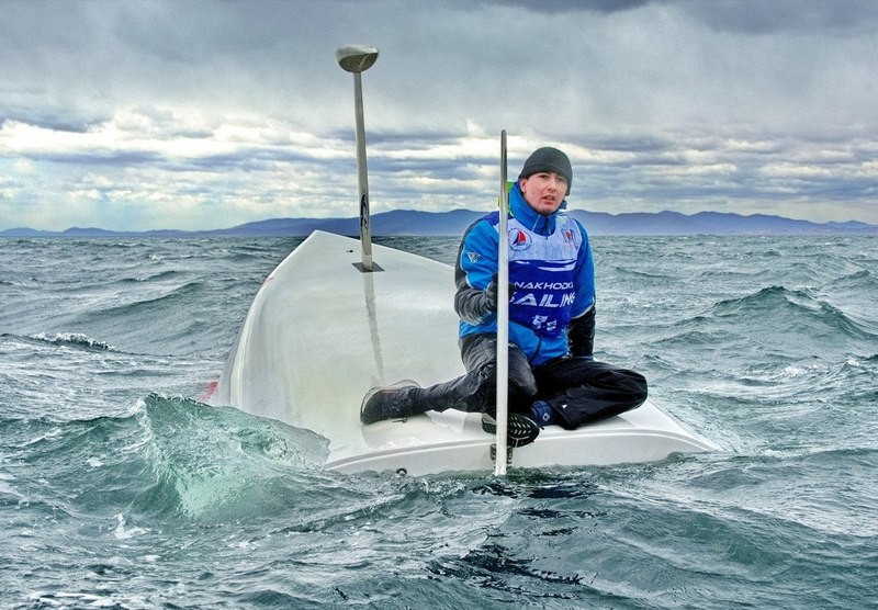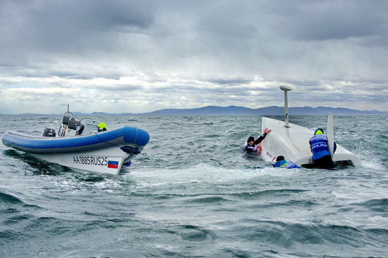 Началась вторая гонка…  Лидировала Nakhodka Sailing Дмитрия Ходырева, но прилетел порыв, последовал брочинг и… оверкиль. Техники и ампайры кинулись на помощь. Людей подняли на лодки, яхту зацепили, дернули – и вернули в нормальное положение. С поврежденной мачтой ее отбуксировали на базу.