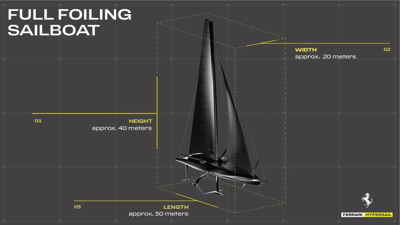 Между тем интересна не только сама яхта Ferrari Hypersail. Хотя она уникальна уже тем, что ее создают без оглядки на существующие правила и рамки классов. Она – исследовательская платформа нового типа: 100-футовый океанский однокорпусник, рассчитанный на стабильный полет на трех точках опоры, с подводным крылом на киле, полной энергетической автономностью и заявкой на выход за пределы привычной морской инженерии.