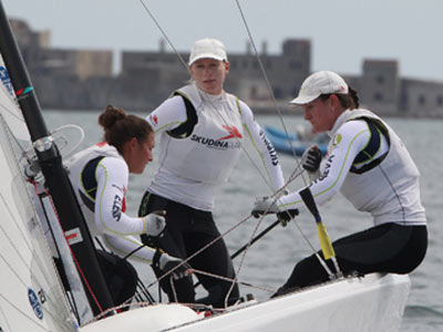 Экипаж Екатерины Скудиной (Москва) в составе шкотовых: Елены Сюзевой (Краснодарский край), Елены Обловой (МО) и запасной Ирины Лоцмановой (Екатеринбург) выиграли полуфинальную дуэль у француженки Клер Леруа и вышли в финал на регате-репетиции олимпийских игр в Лондоне 2012 - Test Event в Веймуте (Великобритания).
